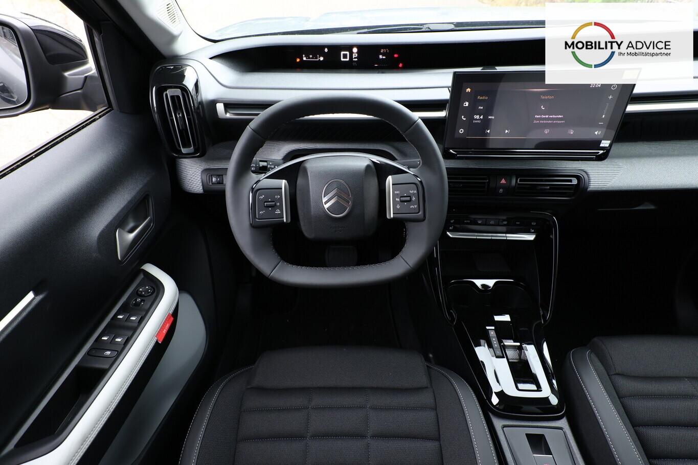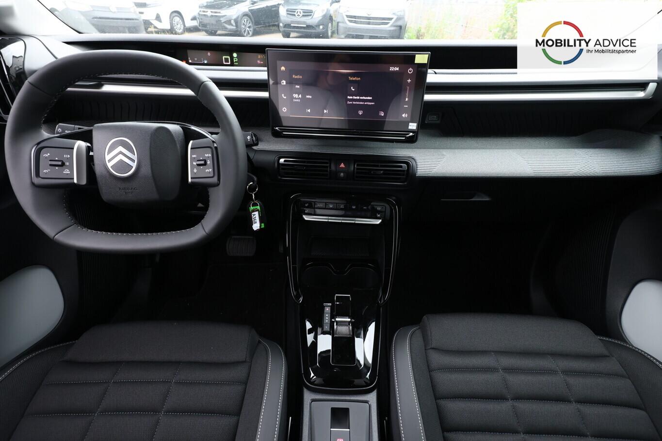 Innenausstattung: Ambiente Metropolitan Grey (Lenkrad heizbar / Sitzheizung vorn / Frontscheibe heizbar / Nebelscheinwerfer LED / Winter-Paket), Anti-Blockier-System (ABS), Audiosystem inkl. 10"-Touchscreen, 6 Lautsprecher, USB-Schnittstelle (Typ C), Elektron. Stabilitäts-Programm (ESP), Fahrassistenz-System: Spurassistent (AFIL), Gepäckraumbeleuchtung, Geschwindigkeits-Regelanlage (Tempomat) inkl. Geschwindigkeits-Begrenzeranlage, Innenraumbeleuchtung LED, Kartentasche an den Rückseiten der Vordersitze, Kindersicherung manuell, Lenkrad mit Multifunktion, Navigation in Verbindung mit dem Smartphone (über Apple Carplay / Android Auto /...), Radioempfang digital (DAB), Reifen 215/60 R17, Schadstoffarm nach Abgasnorm Euro 6e (EU6 EA), Servolenkung, Sitzbezug / Polsterung: Stoff/Kunstleder, Smartphone-Schnittstelle (Apple CarPlay & Android Auto), Verzurrösen im Gepäckraum, Fahrassistenz-System: Automatische Fahrlichtschaltung inkl. Fernlichtassistent (Einschaltautomatik für Fahrlicht), Einparkhilfe hinten inkl. Rückfahrkamera (Rückfahrkamera), Citroen Advanced Comfort Sitze, Heckscheibe heizbar, Heckscheibenwischer, Karosserie: 5-türig, Lenksäule (Lenkrad) mech. höhen-/längsverstellbar, Mild-Hybrid 107 kW (Motor 1,2 Ltr. - 100 kW), Parkbremse elektrisch, Radstand 2670 mm, Sitz vorn links höhenverstellbar, Stahlfelgen 7x17, Steckdose (12V-Anschluß) in Mittelkonsole vorn, Antriebsart: Frontantrieb, Getriebe Automatik - Doppelkupplungsgetriebe (6-Stufen, Hybrid), Klimaautomatik, Airbag Beifahrerseite abschaltbar, Airbag Fahrer-/Beifahrerseite, Kopf-Airbag-System und Seitenairbag, Fensterheber elektrisch hinten, Fensterheber elektrisch vorn, Isofix-Aufnahmen für Kindersitz an Rücksitz, Rücksitzlehne geteilt/klappbar 1/3-2/3, Seitenscheiben hinten und Heckscheibe dunkel getönt, Zentralverriegelung mit Fernbedienung, Head-up-Display (Kombiinstrument hochgesetzt), Dachreling schwarz, Fahrassistenz-System: Verkehrszeichenerkennung, Außenspiegel elektr. verstell-, heiz- und anklappbar, Scheibenwischer mit Regensensor, Scheinwerfer Eco-LED, Tagfahrlicht LED, Reifendruck-Kontrollsystem