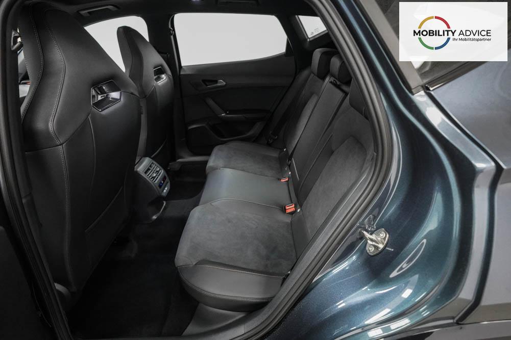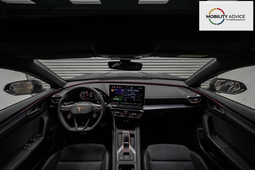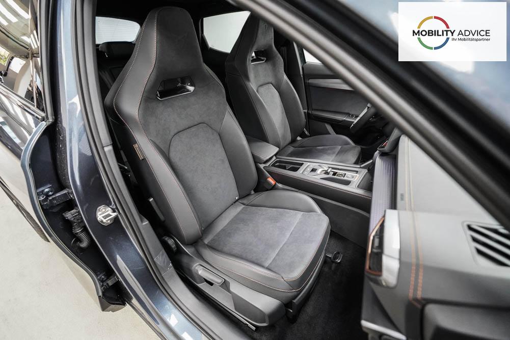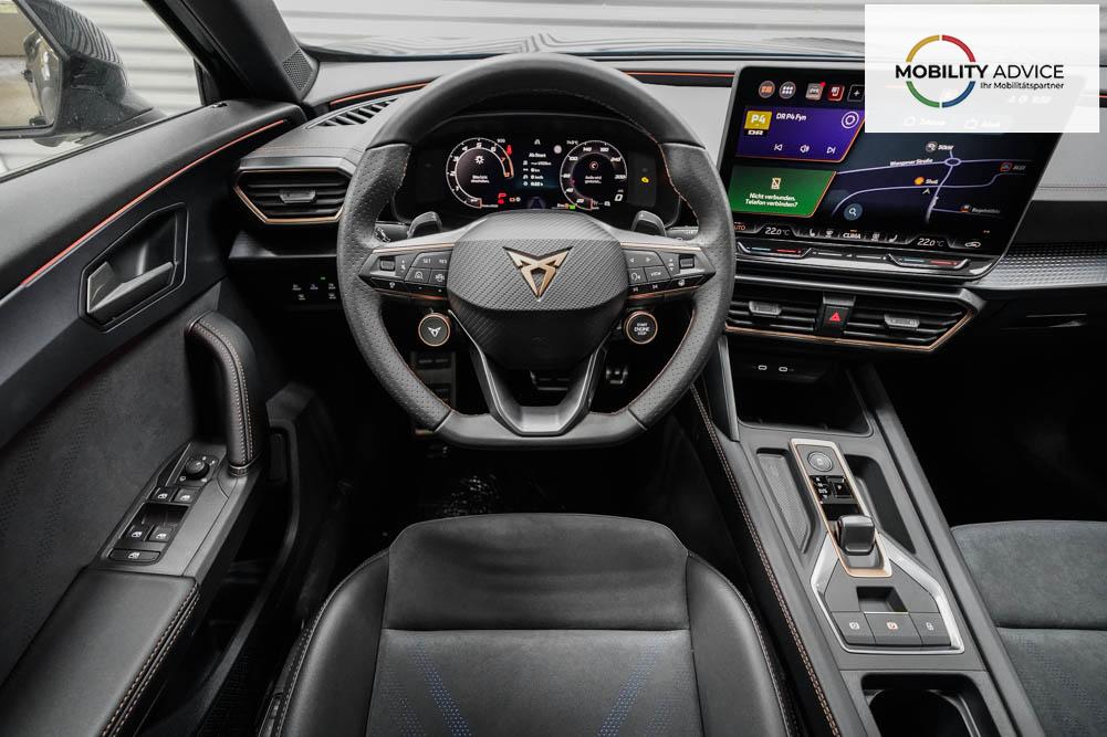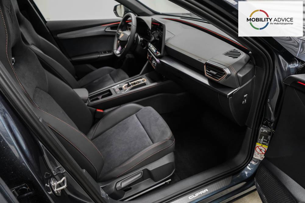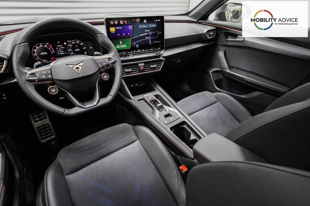 Beifahrersitz höhenverstellbar, Fahrersitz höhenverstellbar, Lederlenkrad, Lendenwirbelstütze, Mittelarmlehne vorne, Sportsitze, Gepäckraumabdeckung, geteilt umklappbare Rücksitzlehne, Lenkrad höhenverstellbar, Sitzbezug Dinamica, Elektrisch verstellbarer Fahrersitz mit Memory, Beheizbares Lenkrad, Multifunktionslenkrad mit Satellitentasten, Isofix, Isofix Beifahrersitz, abgedunkelte Scheiben, 19 Zoll Alufelgen Sandstorm, Dachreling schwarz, ABS, Alarmanlage, Außenspiegel elektrisch, Fensterheber elektrisch, Kopfairbags, Nebelscheinwerfer, Schiebedach, Seitenairbags, Servolenkung, Sitzheizung vorne, DCC, ESP, Wegfahrsperre, Außenspiegel beheizbar, Beifahrerairbag, Fahrerairbag, Parkpilot hinten, Parkpilot vorne, Reifendruckkontrolle, Regensensor, Lichtsensor, Digital Cockpit, Anhängekupplung schwenkbar, Tempomat Abstand ACC, Fernlichtassistent, Spurhalteassistent plus, Totwinkelassistent, Verkehrszeichenerkennung, LED Matrix Scheinwerfer, Tagfahrlicht, Pannenset, Rückfahrkamera, Intelligent Park-Assistent, Panoramadach, Elektrische Heckklappe inkl. Virtual Pedal, KeylessEntry, StartStopSystem, Innenspiegel automatisch abbl., Müdigkeitswarnsystem, Notrufsystem, Schaltwippen, Klimaautomatik 3-Zonen, 360-Grad-Kamera, Geschwindigkeitsbegrenzer, Android Auto, Apple Carplay, Freisprecheinrichtung, Induktionsladestation, Sprachsteuerung, USB, Radio DAB, Bluetooth, Bordcomputer, Radio-Navigationssystem, Cupra Full Link, Full Link, Schalensitze vorne, variabler Ladeboden, Exit Assist, Stauassistent, Pre-Crash, erweiterte Herstellergarantie 5 Jahre/100.000km,