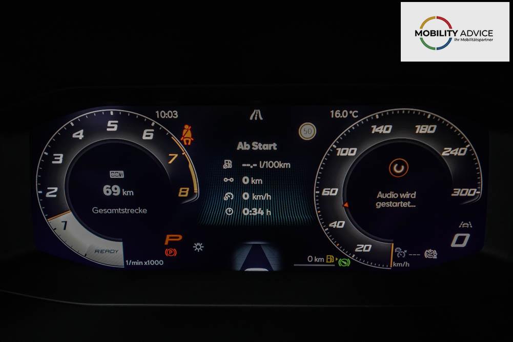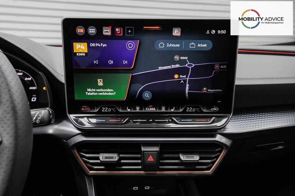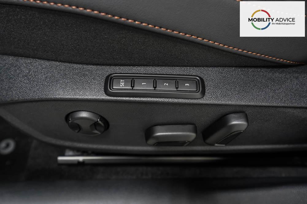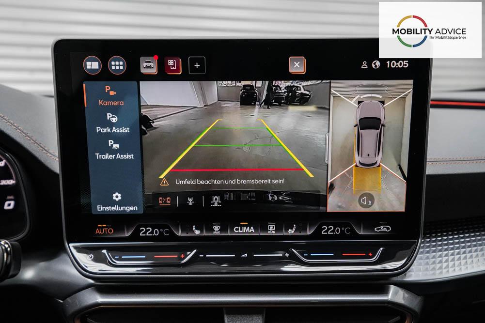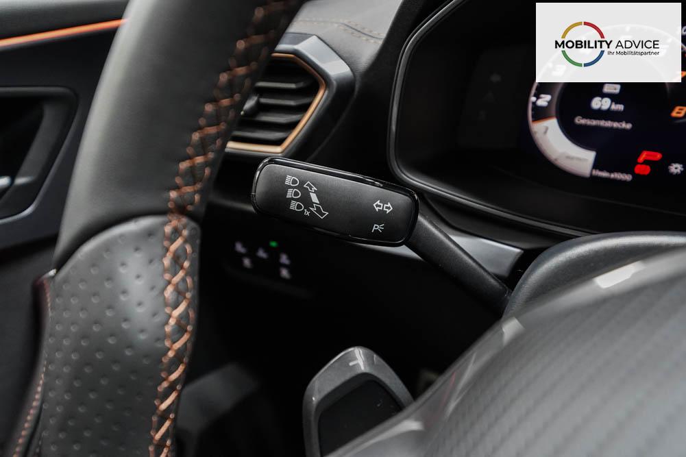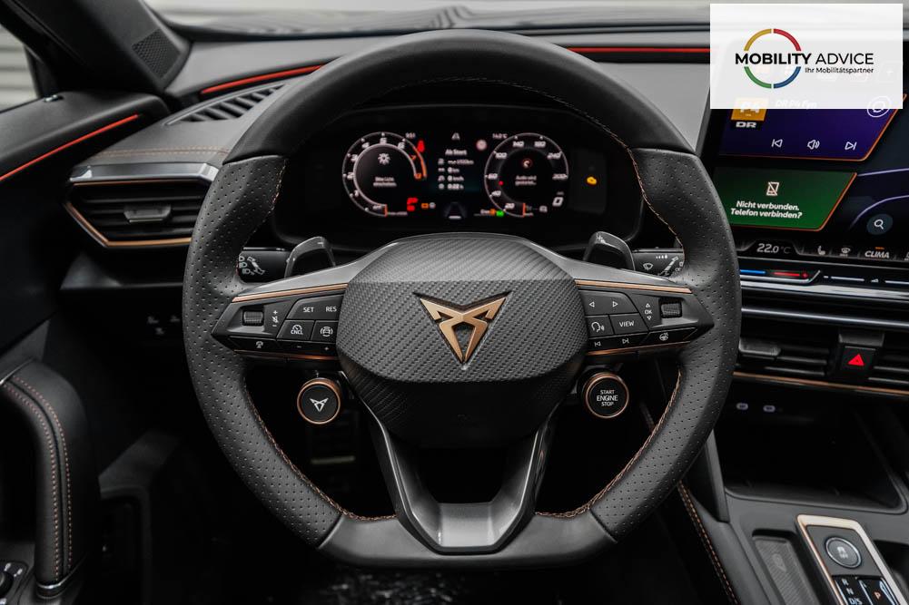 Beifahrersitz höhenverstellbar, Fahrersitz höhenverstellbar, Lederlenkrad, Lendenwirbelstütze, Mittelarmlehne vorne, Sportsitze, Gepäckraumabdeckung, geteilt umklappbare Rücksitzlehne, Lenkrad höhenverstellbar, Sitzbezug Dinamica, Elektrisch verstellbarer Fahrersitz mit Memory, Beheizbares Lenkrad, Multifunktionslenkrad mit Satellitentasten, Isofix, Isofix Beifahrersitz, abgedunkelte Scheiben, 19 Zoll Alufelgen Sandstorm, Dachreling schwarz, ABS, Alarmanlage, Außenspiegel elektrisch, Fensterheber elektrisch, Kopfairbags, Nebelscheinwerfer, Schiebedach, Seitenairbags, Servolenkung, Sitzheizung vorne, DCC, ESP, Wegfahrsperre, Außenspiegel beheizbar, Beifahrerairbag, Fahrerairbag, Parkpilot hinten, Parkpilot vorne, Reifendruckkontrolle, Regensensor, Lichtsensor, Digital Cockpit, Anhängekupplung schwenkbar, Tempomat Abstand ACC, Fernlichtassistent, Spurhalteassistent plus, Totwinkelassistent, Verkehrszeichenerkennung, LED Matrix Scheinwerfer, Tagfahrlicht, Pannenset, Rückfahrkamera, Intelligent Park-Assistent, Panoramadach, Elektrische Heckklappe inkl. Virtual Pedal, KeylessEntry, StartStopSystem, Innenspiegel automatisch abbl., Müdigkeitswarnsystem, Notrufsystem, Schaltwippen, Klimaautomatik 3-Zonen, 360-Grad-Kamera, Geschwindigkeitsbegrenzer, Android Auto, Apple Carplay, Freisprecheinrichtung, Induktionsladestation, Sprachsteuerung, USB, Radio DAB, Bluetooth, Bordcomputer, Radio-Navigationssystem, Cupra Full Link, Full Link, Schalensitze vorne, variabler Ladeboden, Exit Assist, Stauassistent, Pre-Crash, erweiterte Herstellergarantie 5 Jahre/100.000km,