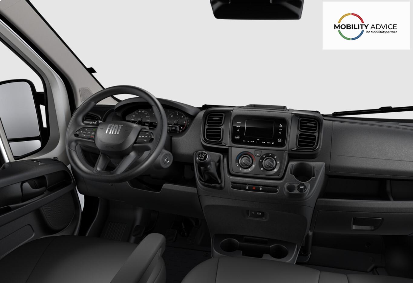 Klimaanlage, Infotainment-System mit 5" Farbdisplay, DAB und Bluetooth-Schnittstelle, Fahrassistenz-System: Spurhalteassistent, Geschwindigkeits-Regelanlage (Tempomat) inkl. Geschwindigkeits-Begrenzeranlage, Airbag Beifahrerseite, Licht- und Regensensor, Laderaumtrennwand, Reifendruck-Kontrollsystem, Nebelscheinwerfer, Außenspiegel elektr. verstell- und heizbar, Hinterachse verstärkt (Federung), Reserverad vollwertig (inkl. Ersatzradhalter), Ablage im Dachhimmel Fahrerhaus, Kraftstofftank: 90 Ltr., 12V-Steckdose vorn, Bedienhebel am Lenkrad, Blinkleuchten in Außenspiegel integriert, Bordcomputer, Diebstahlsicherung (Fiat Code), Einparkhilfe hinten, Fahrersitz mit Lendenwirbelstütze und Armlehne, Gurtwarnanlage, Handschuhfach, Heckflügeltüren (Öffnungswinkel 180 Grad), Innenraumbeleuchtung vorn, Kopfstützen höhenverstellbar, Lenkrad (Lenksäule) verstellbar, Reifen 215/70 R15, Rückfahrkamera, Schadstoffarm nach Abgasnorm Euro 6e (EU6 EA), Servolenkung, Sitz vorn links höhenverstellbar, Sitzbezug / Polsterung: Stoff, Stahlfelgen 15 Zoll, Tagfahrlicht, Verglasung wärmedämmend, Verzurrösen, Elektron. Stabilitäts-Programm (ESP) (Antriebs-Schlupfregelung (ASR) / Fahrassistenz-System: Berganfahr-Assistent), Heckflügeltüren ohne Verglasung, Karosserie/Aufbau: Kasten Grossraum Standard, Karosserievariante: Hochdach, Motor 2,2 Ltr. - 103 kW Turbodiesel Multijet, Radstand 4035 mm, Schiebetür Lade-/Fahrgastraum rechts, Sitze im Fahrerhaus: Beifahrerdoppelsitz, Anti-Blockier-System (ABS), Antriebsart: Frontantrieb, Getriebe 6-Gang, Airbag Fahrerseite, Fensterheber elektrisch vorn, Zentralverriegelung mit Fernbedienung, Rußpartikelfilter, Start/Stop-Anlage Motor