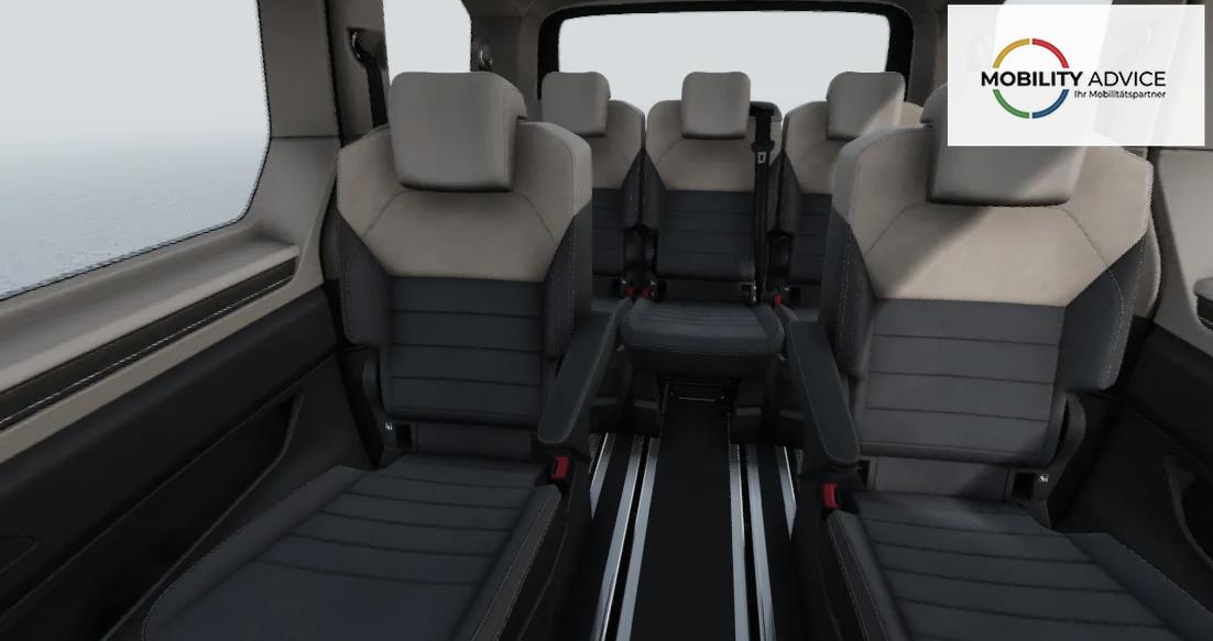 Verlängerung der Bodenschienen nach vorne zu den Vordersitzen, zur Integration eines Multifunktionstisches/einer Mittelkonsole